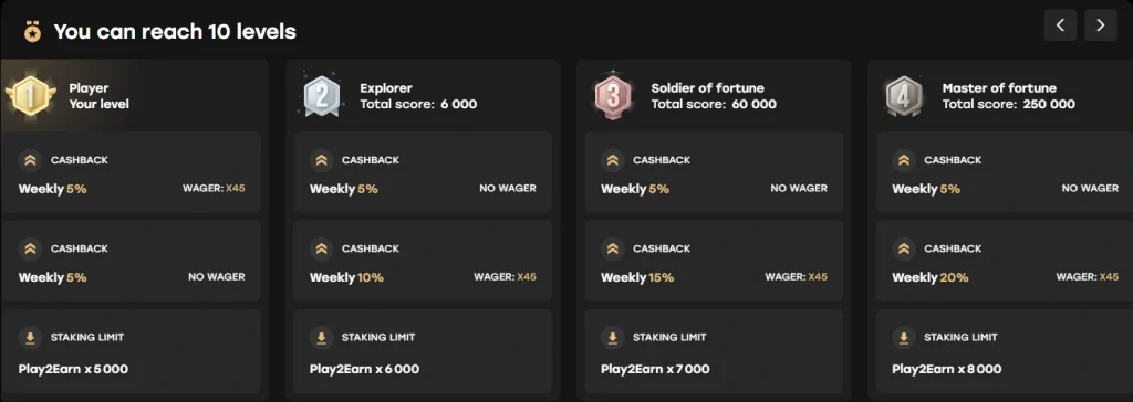 | Level | Daily Real Cashback | Weekly Real Cashback | Weekly Bonus Cashback | Points Requirement |